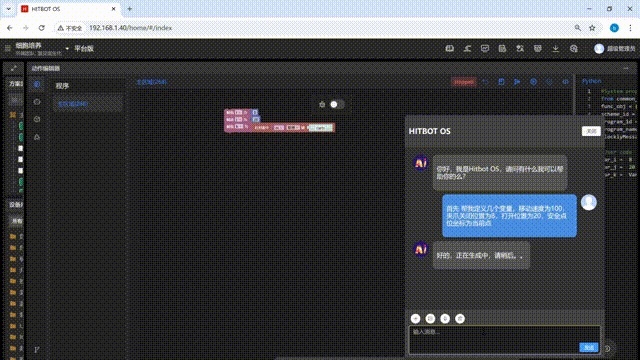 HITBOT OS可以根據自然語言生成圖形化代碼,用戶也可以通過自然語言直接操作機器人及其它部件的運動,實現真正的“零門檻”編程。這種交互方式打破了傳統自動化對專業編程的依賴,實現自然語言與圖形化編程的無縫銜接,將傳統需數日完成的編程開發壓縮至幾十分鐘,顯著降低了自動化部署的技術壁壘,重新定義機器人操作的人機交互方式。